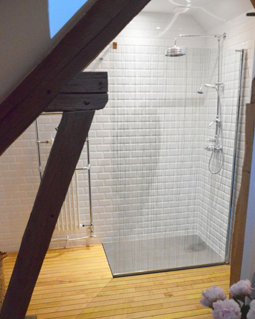 Sous les toits, la chambre bénéficie d’une luminosité exceptionnelle grâce aux fenêtres de toit et aux belles poutres apparentes, créant une atmosphère chaleureuse et cosy. Parfaite pour profiter d’un séjour reposant dans notre maison d’hôtes de charme, cette chambre allie confort, style et authenticité.