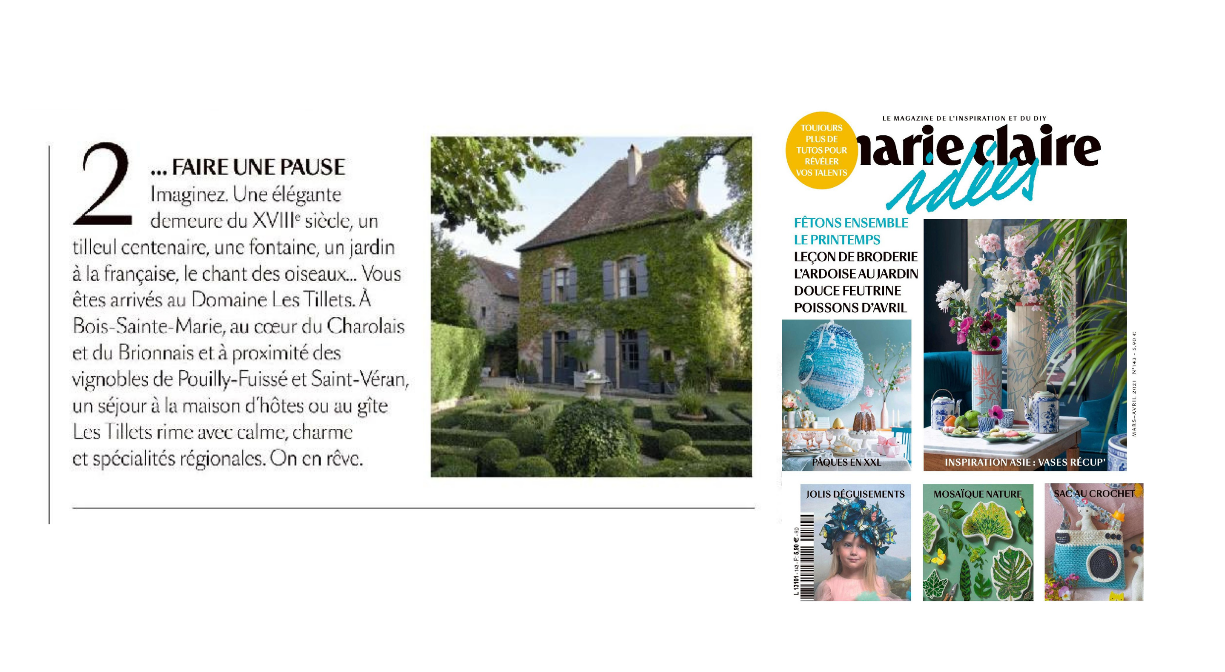 C’est dans cette édition de Marie Claire Idées sur le thème printanier parue en mars-avril 2021, que notre Domaine laissant apparaître ses premières couleurs de saison, fut présenté