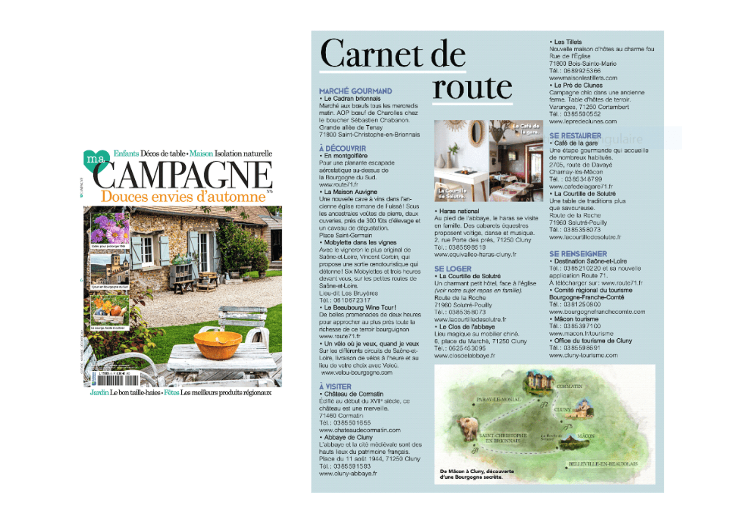 C’est dans cette édition d’octobre 2021 du magazine Ma Campagne, que le Domaine Les Tillets a figuré parmi les adresses du Carnet de route